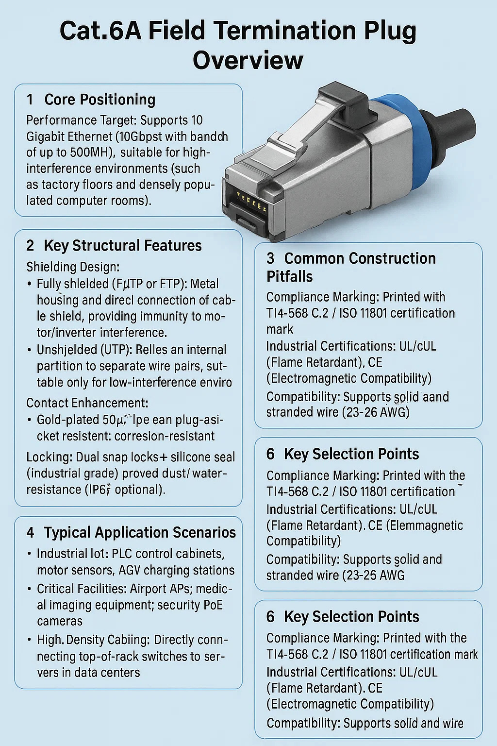 | Feature | Cat.6A Field Termination Plug | Standard Cat.6 Crimp Plug | Praktisk Impact |