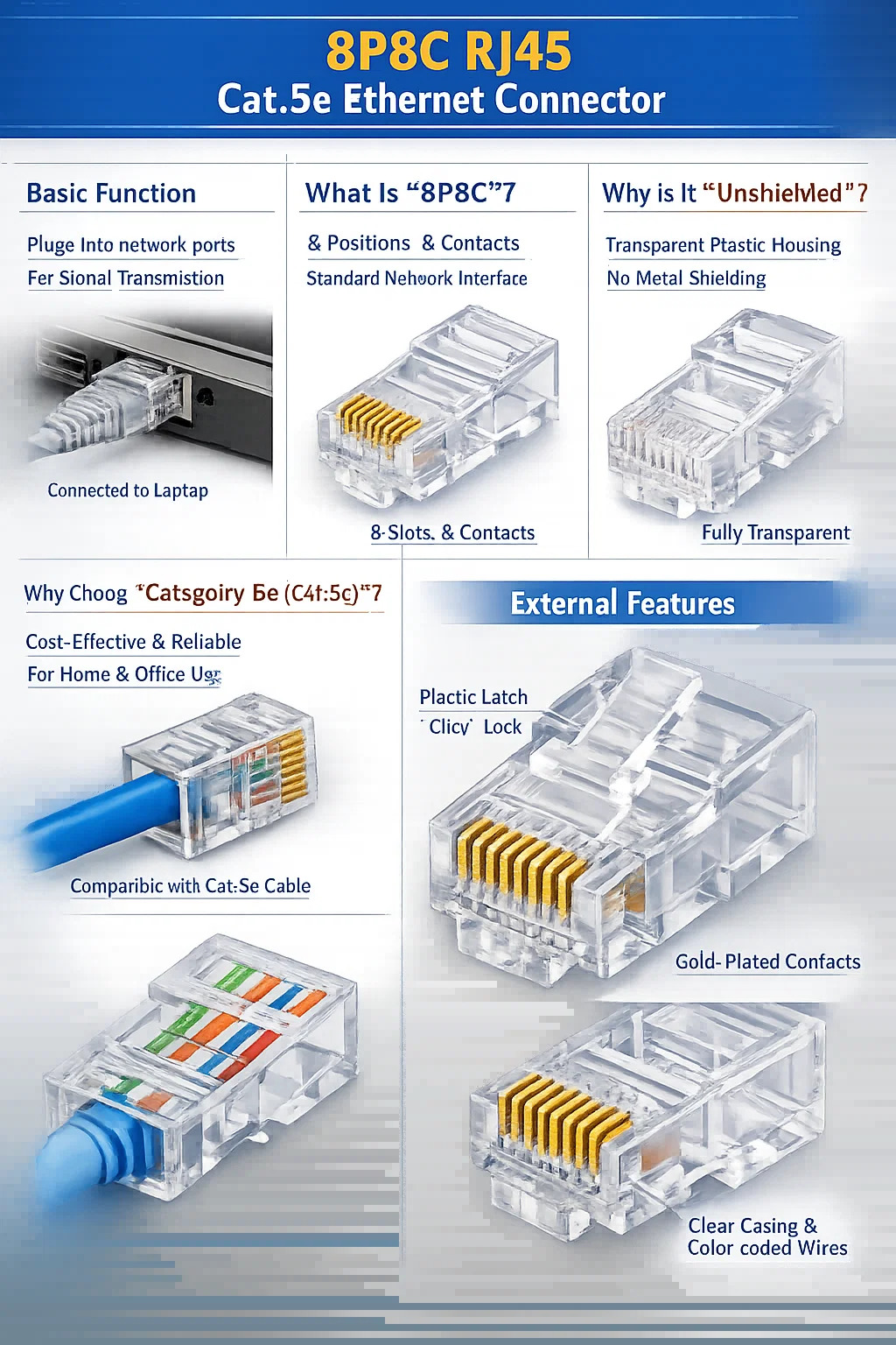 Forgyldte kontakter: Der er otte små, kamlignende kobberkontakter på hovedet, normalt med et tyndt lag guldbelægning på overfladen. Denne guldbelægning forhindrer kobberkontakterne i at ruste, hvilket sikrer, at netværket ikke vil opleve forbindelsesproblemer på grund af dårlig kontakt i årevis eller endda årtier.