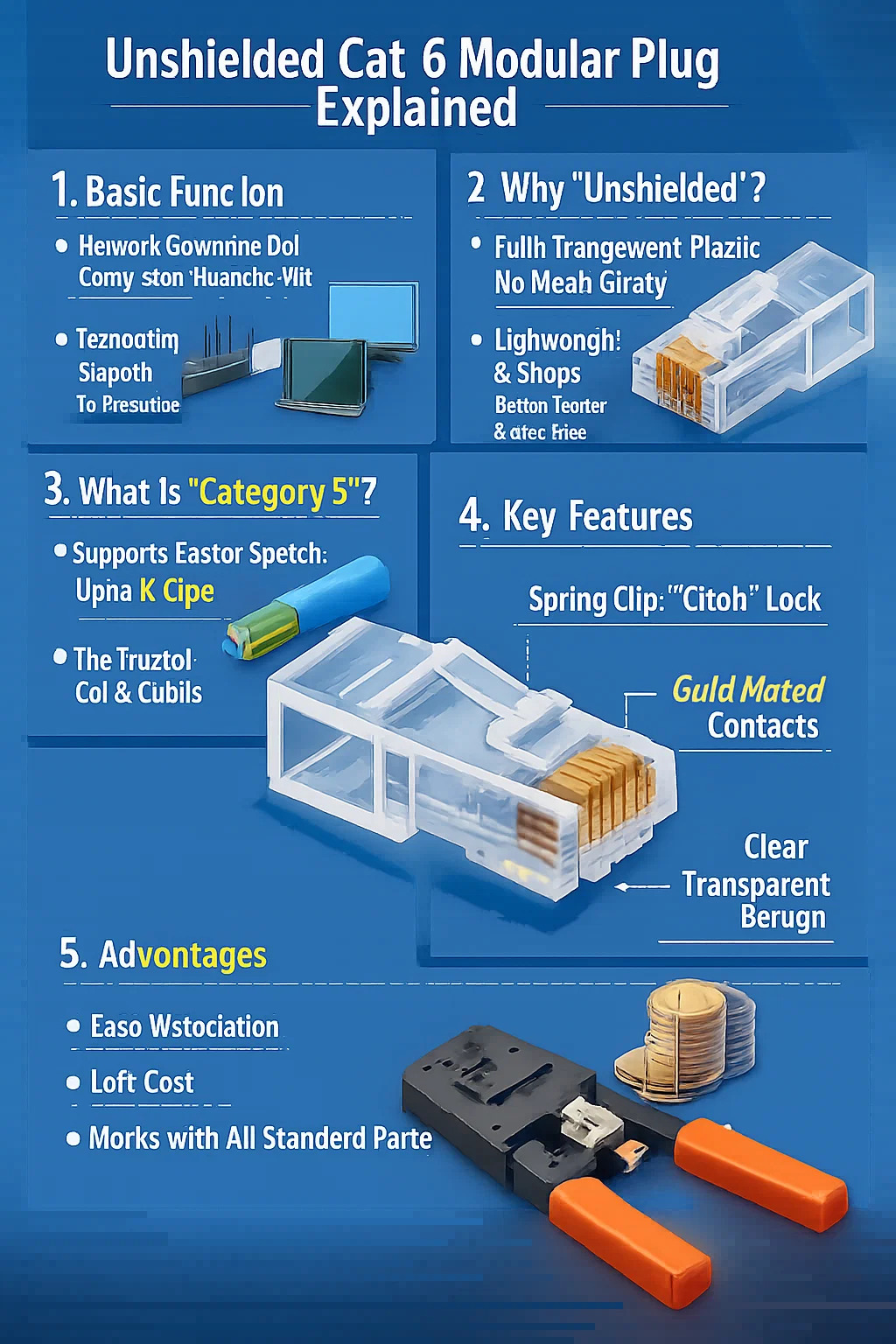 Dette uskærmet Cat.6 modulstik er faktisk den mest almindelige type gennemsigtige netværkskabelstik, vi ser hver dag. Hvis du holder et almindeligt husholdningsnetværkskabel, er det gennemsigtige plastikstik med en lille fjederclips for enden højst sandsynligt denne type.